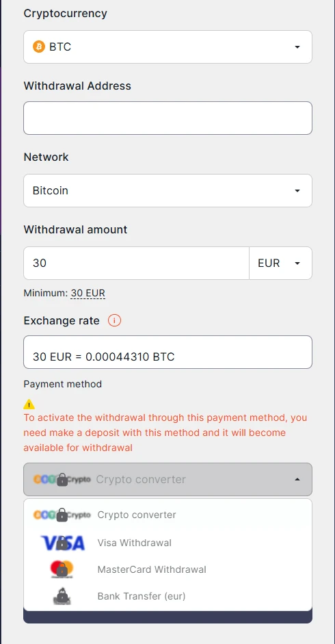 Crypto-opnames zijn beschikbaar van €40 tot €5.000, met verwerking aangegeven als 0–24 uur. De BinoBet daglimiet voor opnames is €10.000 en onze maandlimiet voor opnames is €50.000 per account. Als je een grotere opname plant, controleer dan je beschikbare limiet in de kassa voordat je de aanvraag indient.