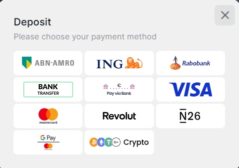| Opnamemethoden | Visa, Mastercard, MiFinity, Bankoverschrijving, Crypto |